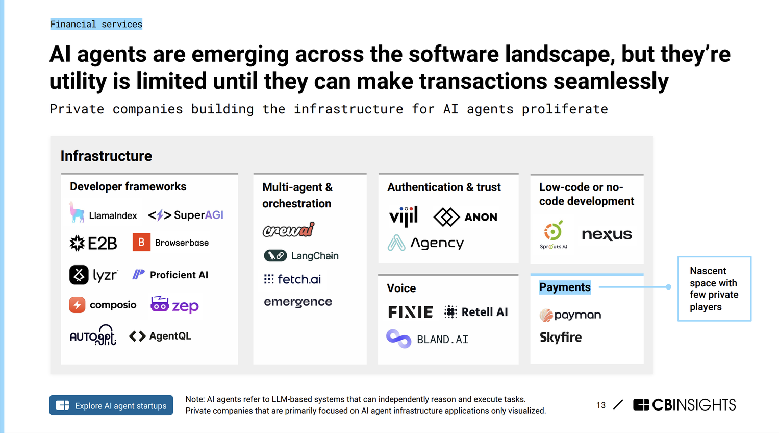 Dimentica il vecchio portafoglio di pelle, ora è tutto su AI e criptovalute. Gli agenti di intelligenza artificiale stanno finalmente imparando a fare qualcosa di utile: pagare per noi. Stripe ha lanciato strumenti per carte virtuali, mentre Coinbase ha deciso di infilare i portafogli crypto direttamente nei circuiti degli agenti. Sembra che il mercato ci creda, visto che ha buttato oltre 2 miliardi di dollari in questo settore solo quest'anno. E non sono solo le startup come Skyfire a fare il botto con i finanziamenti di Coinbase Ventures; anche i colossi come Google e Amazon non vogliono perdere il treno. Ma aspetta, c'è di più! Okta e Ping Identity stanno costruendo un 'strato di fiducia' per la gestione delle identità, perché sì, anche i robot hanno bisogno di una carta d'identità. E mentre ci avviciniamo al 2025, preparati a vedere le criptovalute diventare il metodo di pagamento preferito dagli agenti AI, aprendo la strada a una nuova era di spesa autonoma. CbInsights