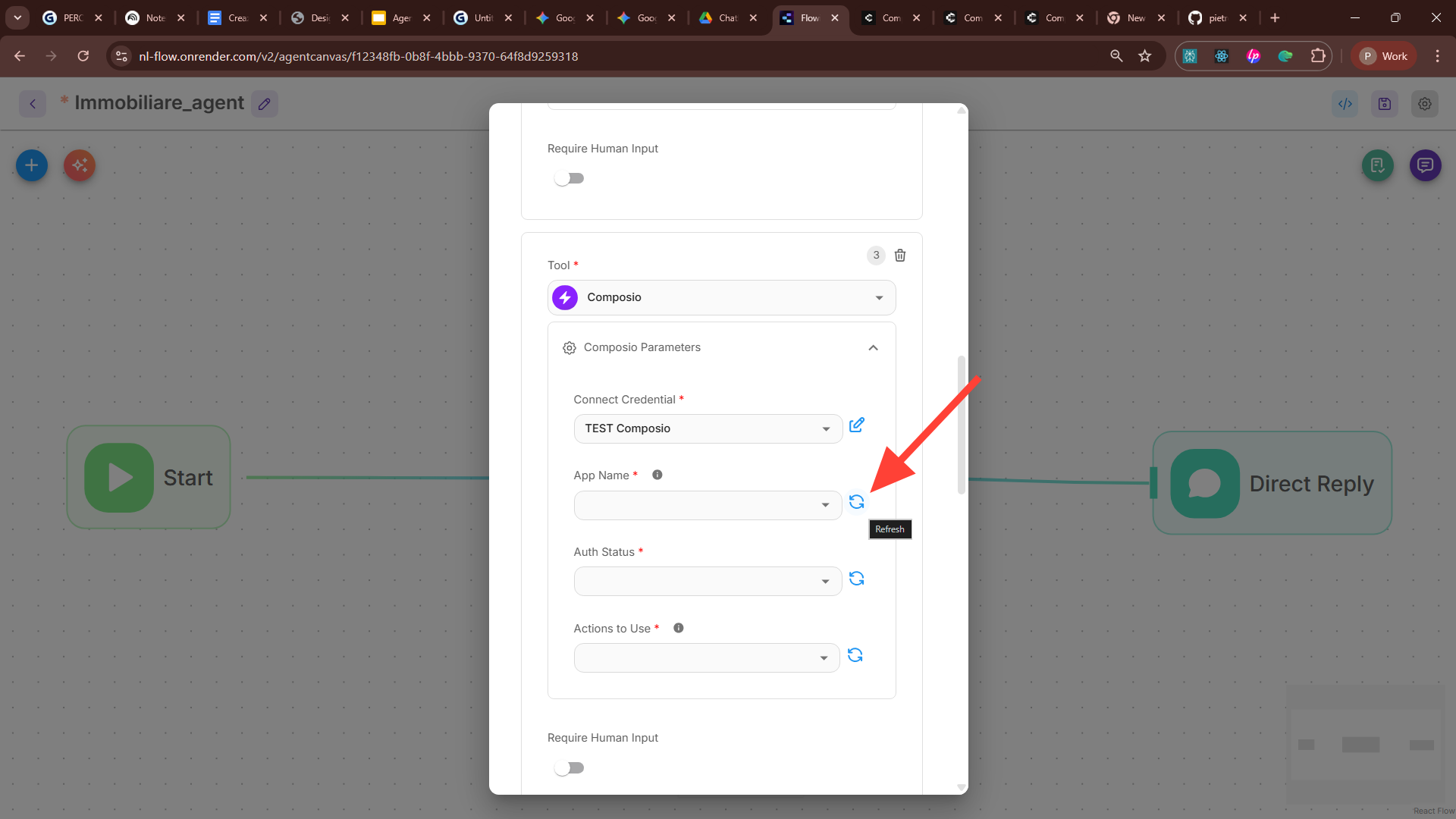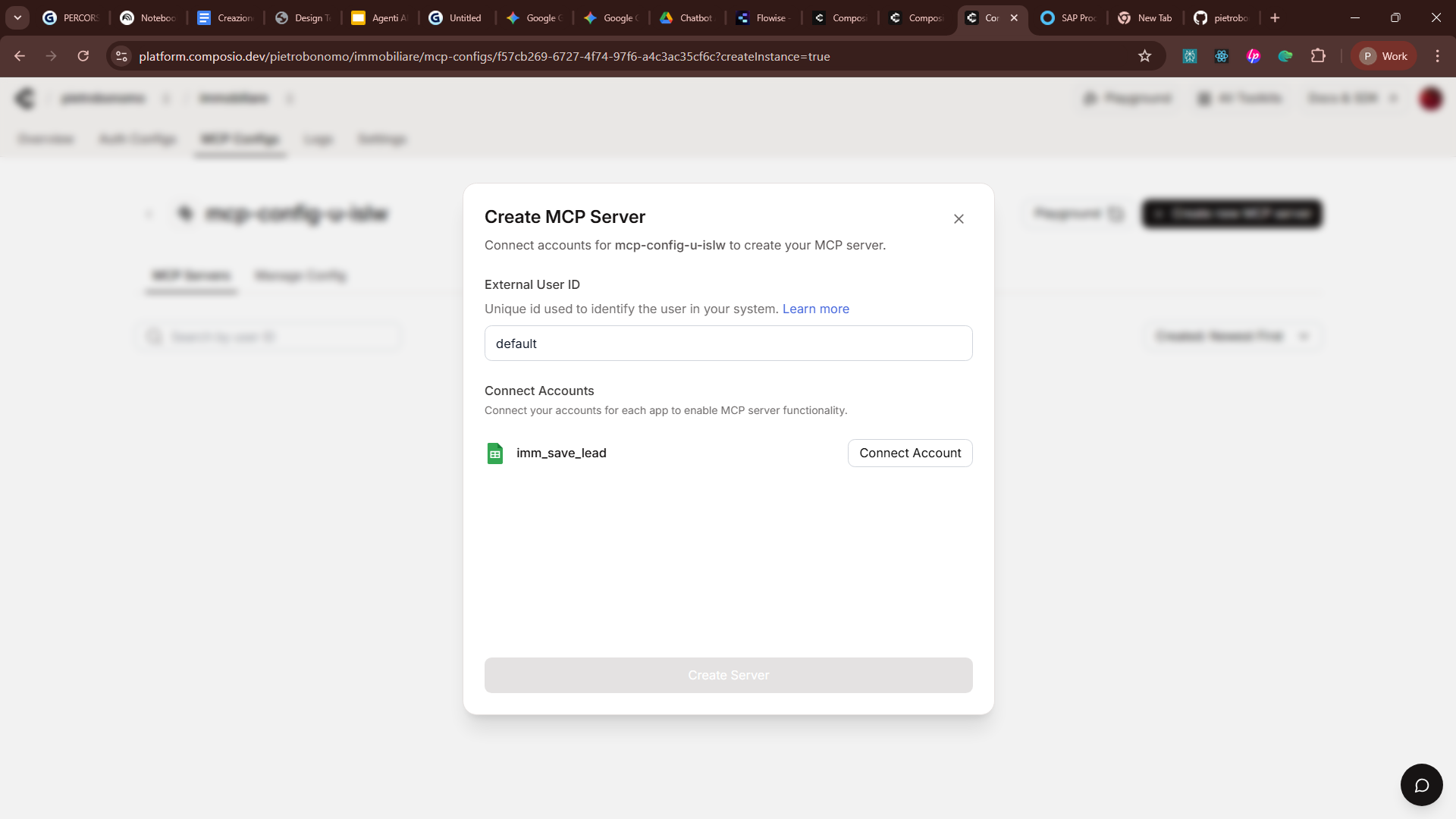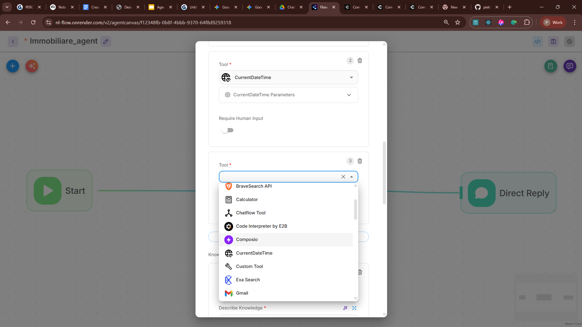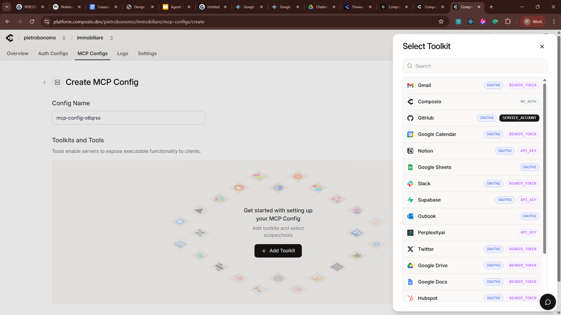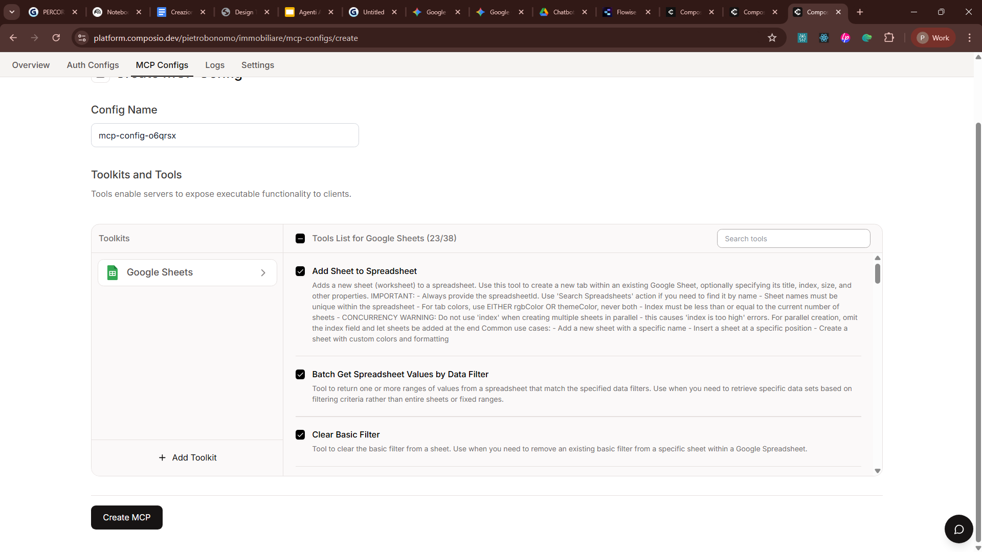 Flowise parla quella lingua. Nel nostro caso, ho scelto Composio, che raccoglie centinaia di MCP, per connettermi ai tool che mi servono: Gmail per il follow-up al cliente e Calendar per fissare appuntamenti.