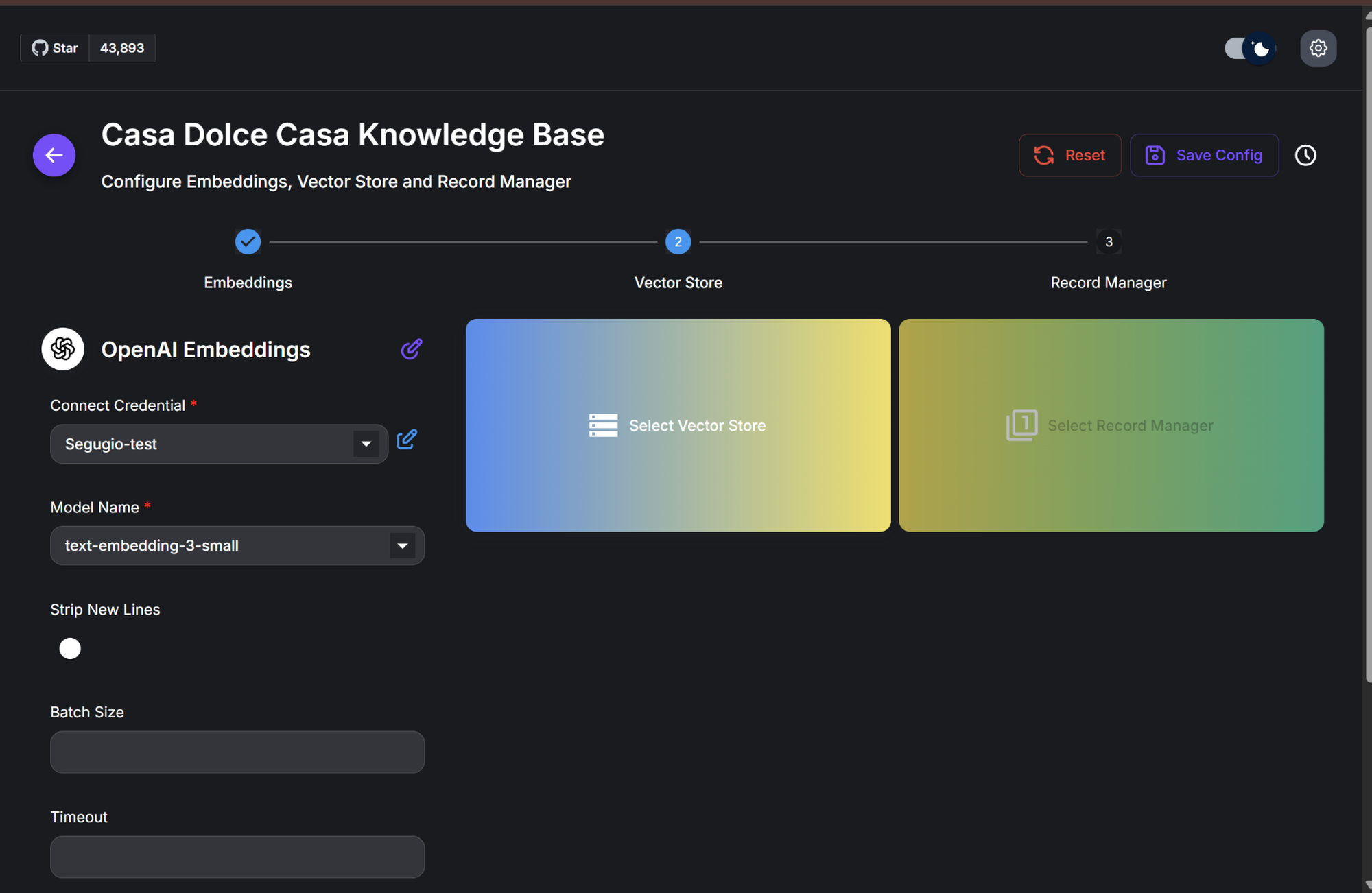 seleziona il modello di embedding text-embedding-3-small , scegli 1536 come dimensione
