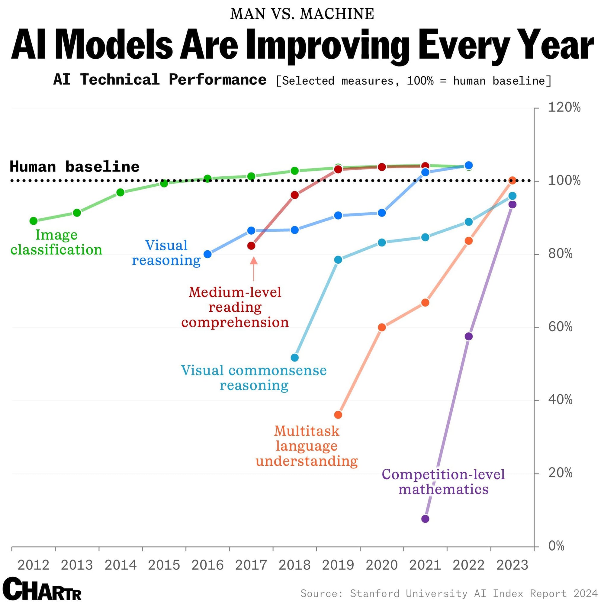 L’ultimo rapporto dell’AI Index 2024, pubblicato dall’Università di Stanford, segnala un progresso notevole per l’intelligenza artificiale. Questa ora supera le prestazioni umane in ambiti come la classificazione delle immagini, il ragionamento visivo e la comprensione testuale. Nonostante questi successi, l’IA presenta ancora delle carenze in ambito matematico a livello competitivo. Gli esperti del settore mostrano un cauto ottimismo sui benefici che tali avanzamenti potrebbero portare in diversi settori, evidenziando la necessità di gestire attentamente l’integrazione dell’IA nelle nostre società. Per dettagli aggiuntivi, consultare il rapporto completo su AI Index Report.
