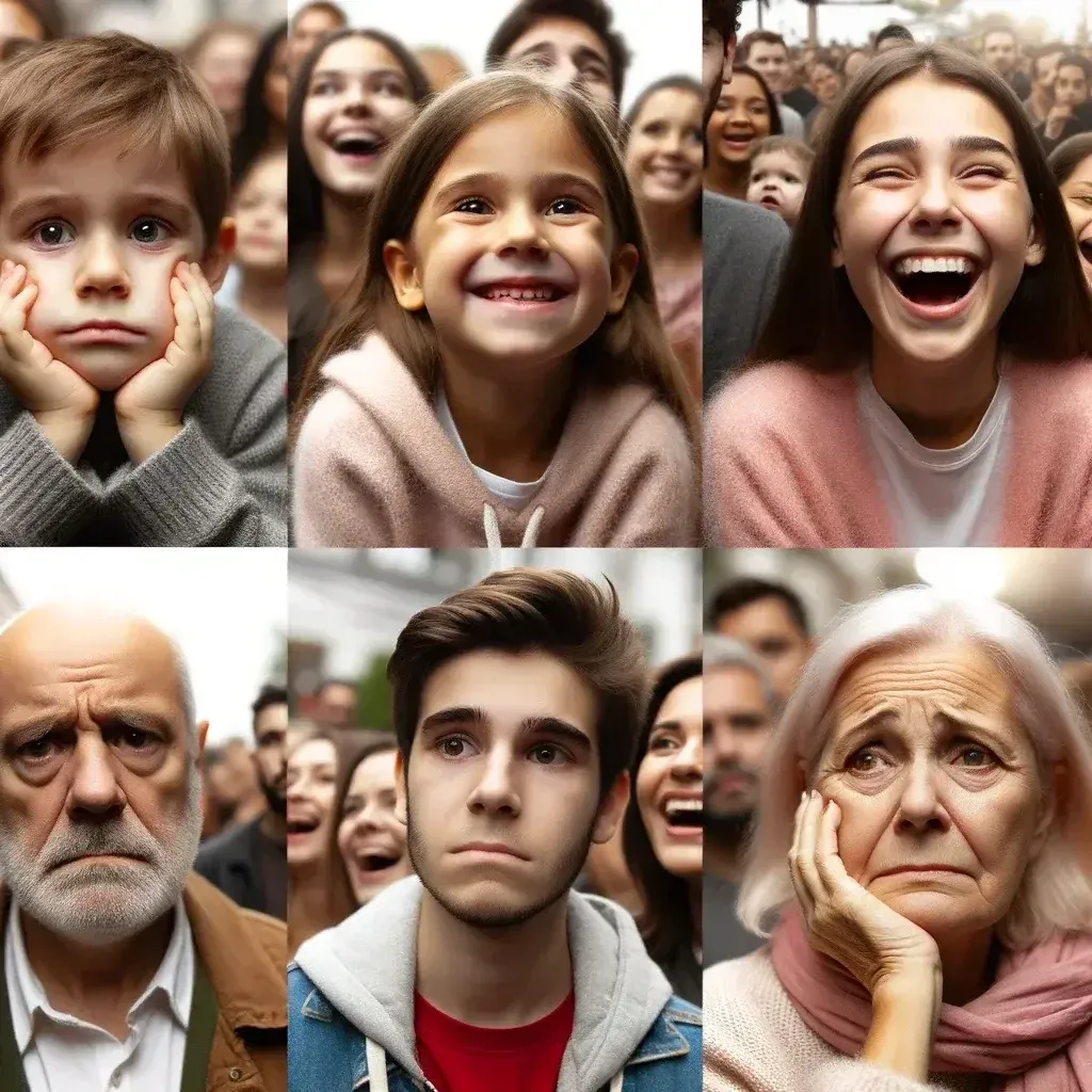 Dall'immagine fornita, si può osservare una varietà di espressioni sulle facce delle persone. La maggior parte delle persone sembra mostrare espressioni di sorpresa, divertimento o stupore. Tuttavia, c'è anche una persona con un'espressione seria e preoccupata e un'altra che appare triste. In generale, la maggior parte delle persone sembra avere una reazione positiva o di sorpresa a ciò che stanno guardando.A primo impatto,