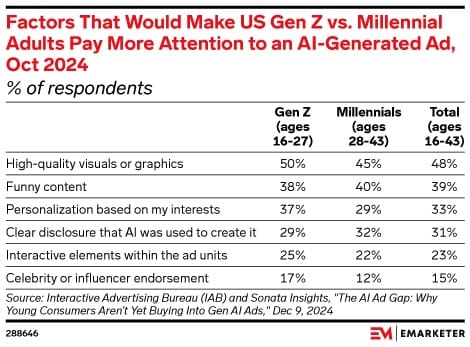 Secondo un'indagine dell'Interactive Advertising Bureau (IAB) e Sonata Insights, il 45% dei Millennials e il 50% dei Gen Zers sono attratti dalle pubblicità generati dall'intelligenza artificiale solo se le immagini sono di alta qualità. Quindi niente più sconti su mani a 6 dita o terze gambe che compaiono e scompaiono. Le celebrità hanno perso il loro fascino: solo il 12% dei Millennial e il 17% dei Gen Z si lascia influenzare dalle star. Ma ecco il colpo di scena: mentre l'80% degli inserzionisti è entusiasta dell'uso dell'AI generativa, un buon 32% dei Gen Z e il 23% dei Millennial si fida meno delle aziende che la usano. Sarà forse che c'è troppo rumore? Sembra che gli utenti siano alla ricerca di autenticità, ma sai cosa? Si abitueranno e si dimenticheranno che preferiscono vedere gli umani veri nelle pubblicità, mentre per le opinioni preferiranno vedere gli umani. Scommetti? eMarketer
