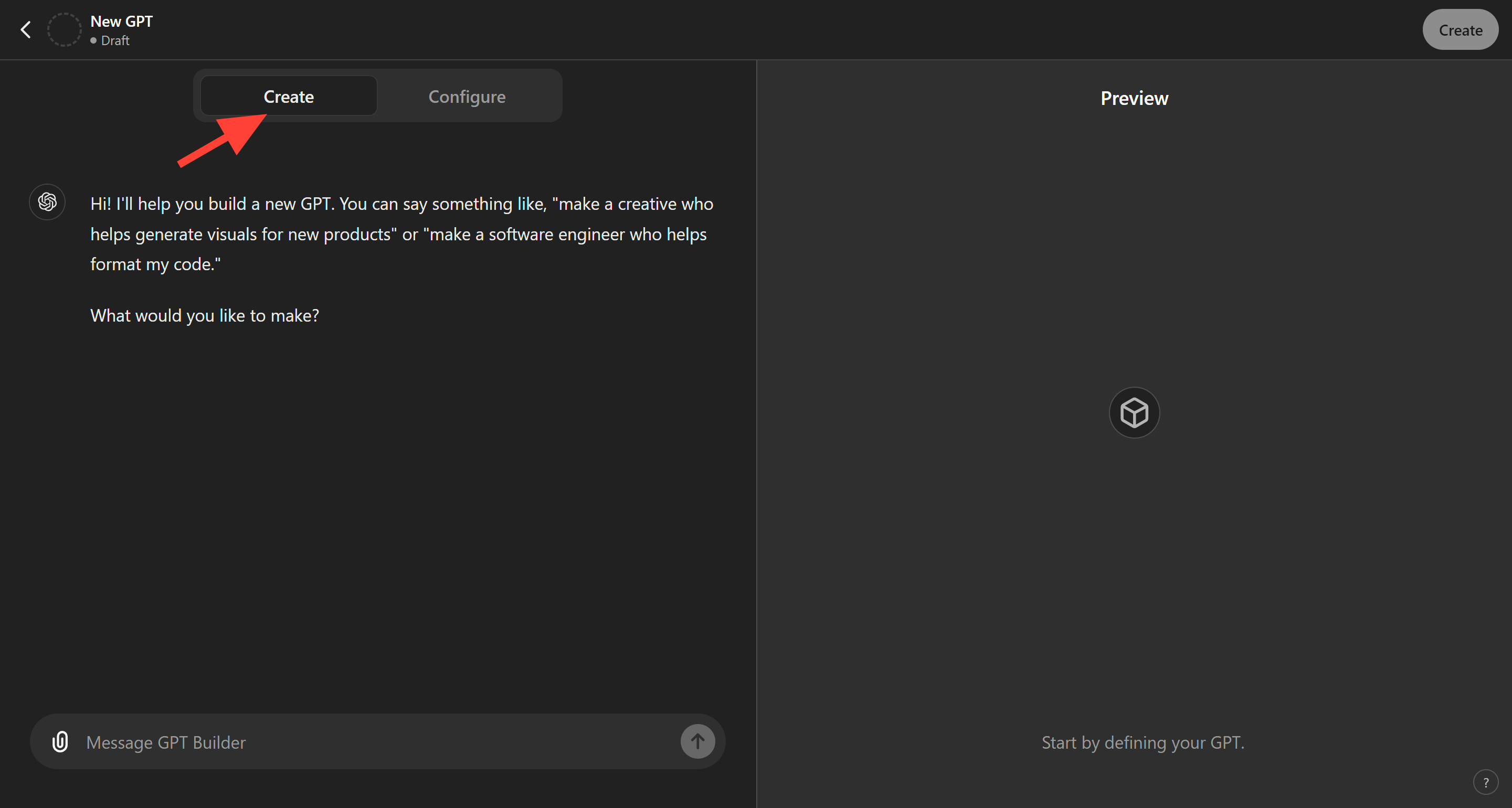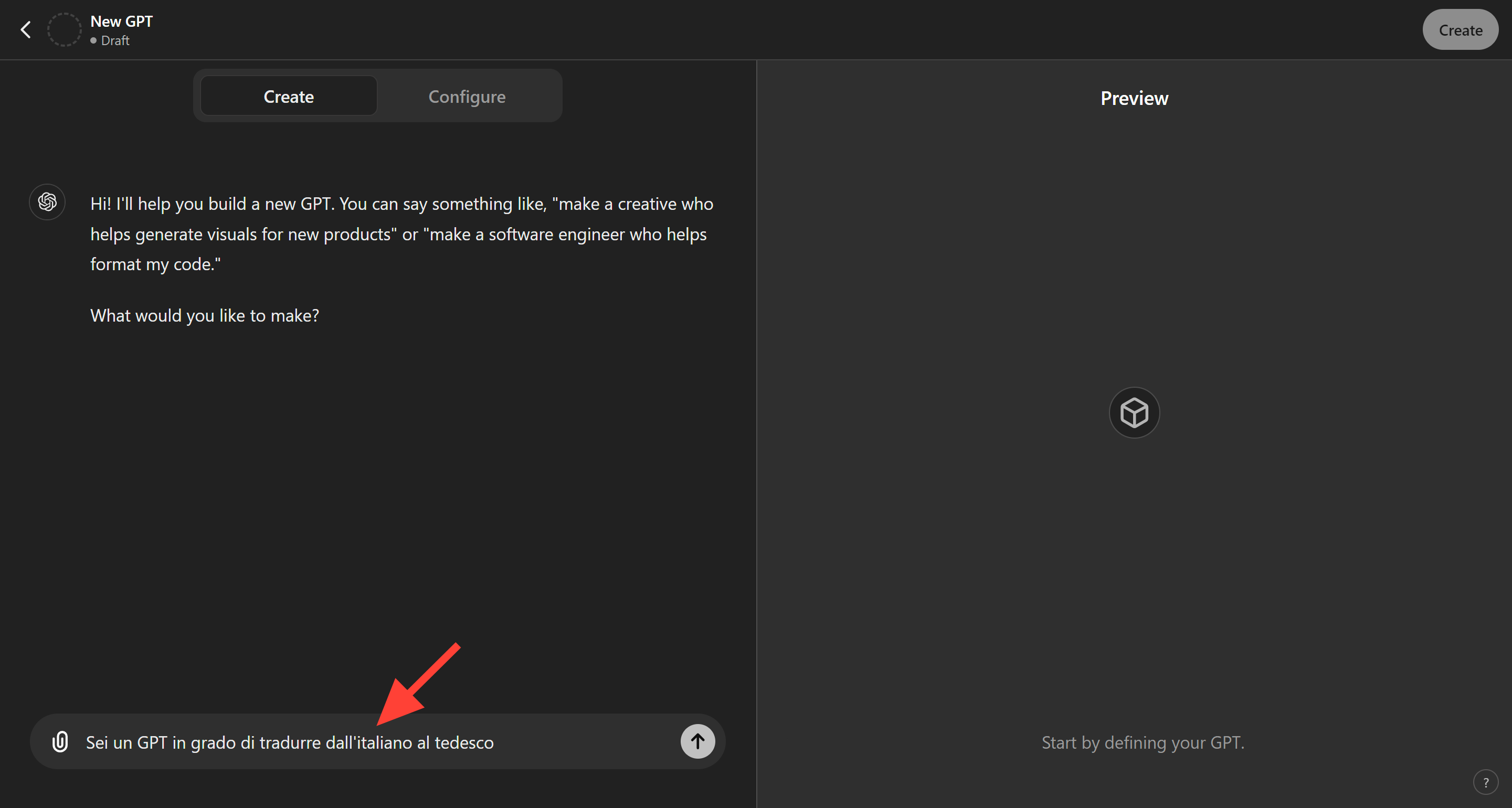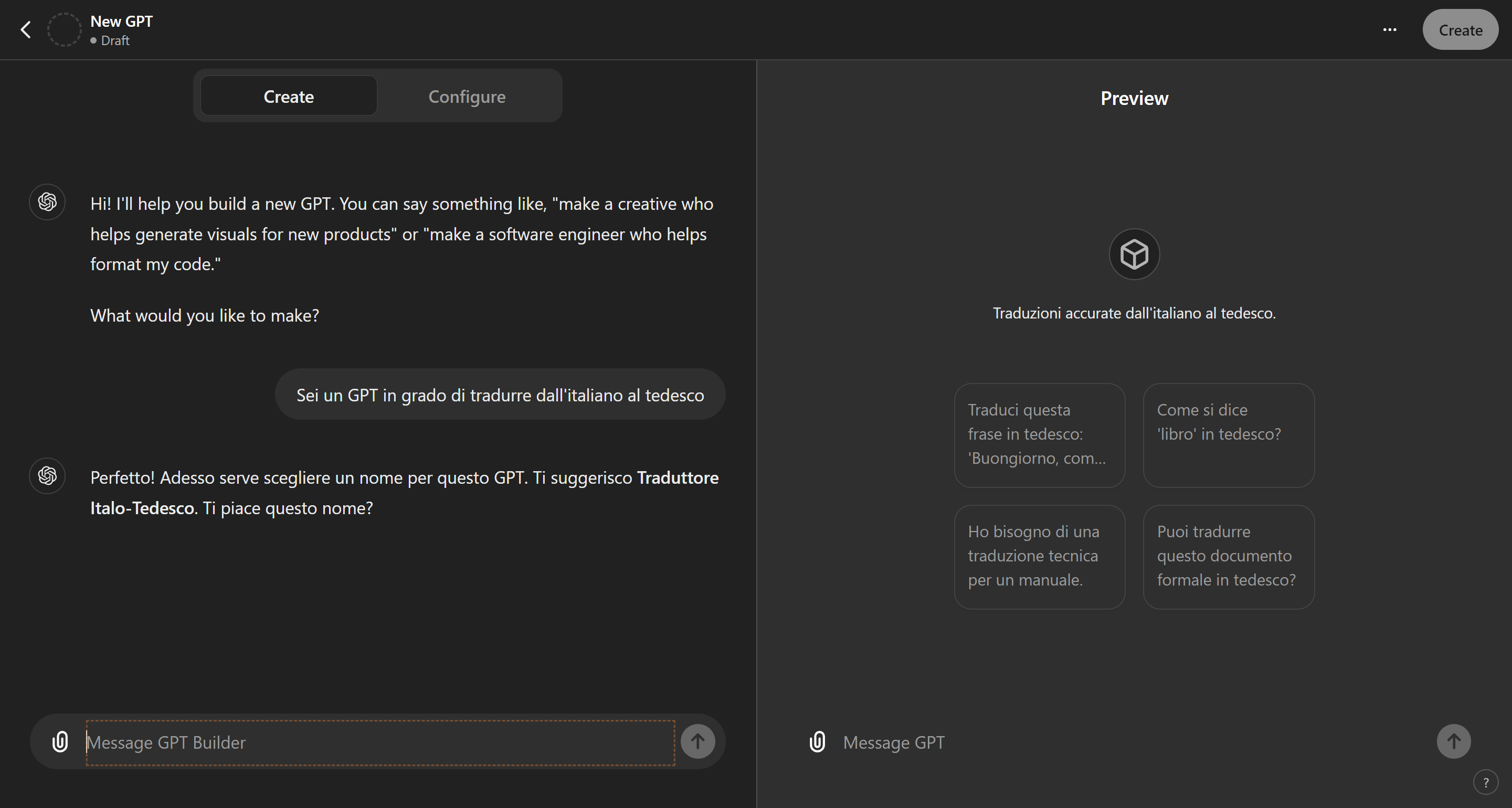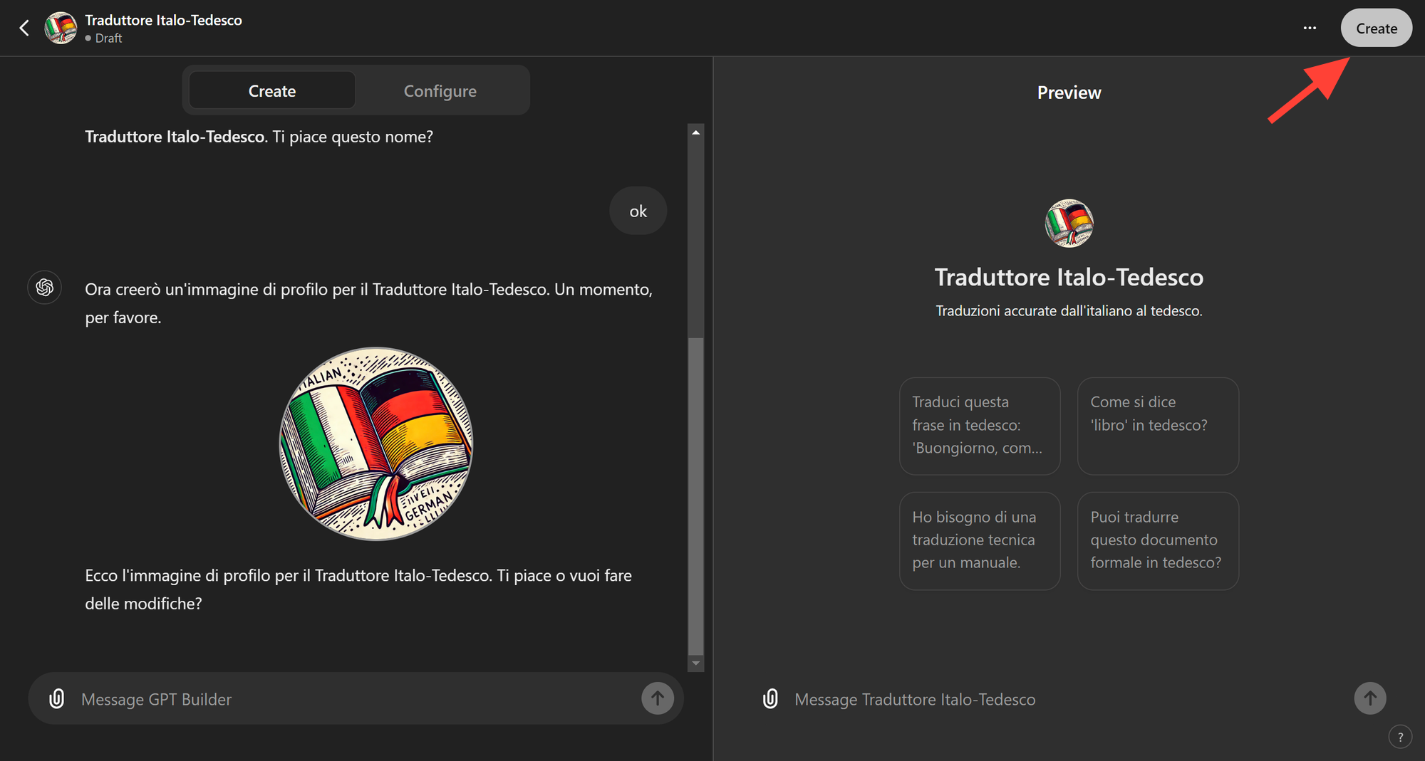 Clicca su "Explore GPT'sClicca su "Create"Rimani sulla tab "Create"Spiega cosa vuoi ottenere dal tuo GPTContinua a dialogare con l'assistente che ti aiuterà a trovare un nome e creare un'immagineIl tuo GPT è stato creato automaticamente: immagine, titolo, funzionalità e conversation starter. Nella parte destra dello schermo puoi provare il tuo GPT; se ti soddisfa, puoi cliccare su "Create".Scegli il metodo di pubblicazione e clicca "Save".