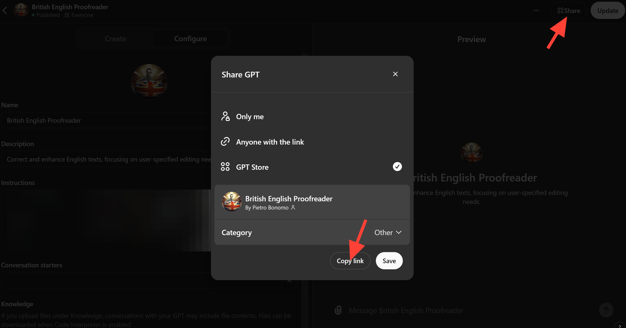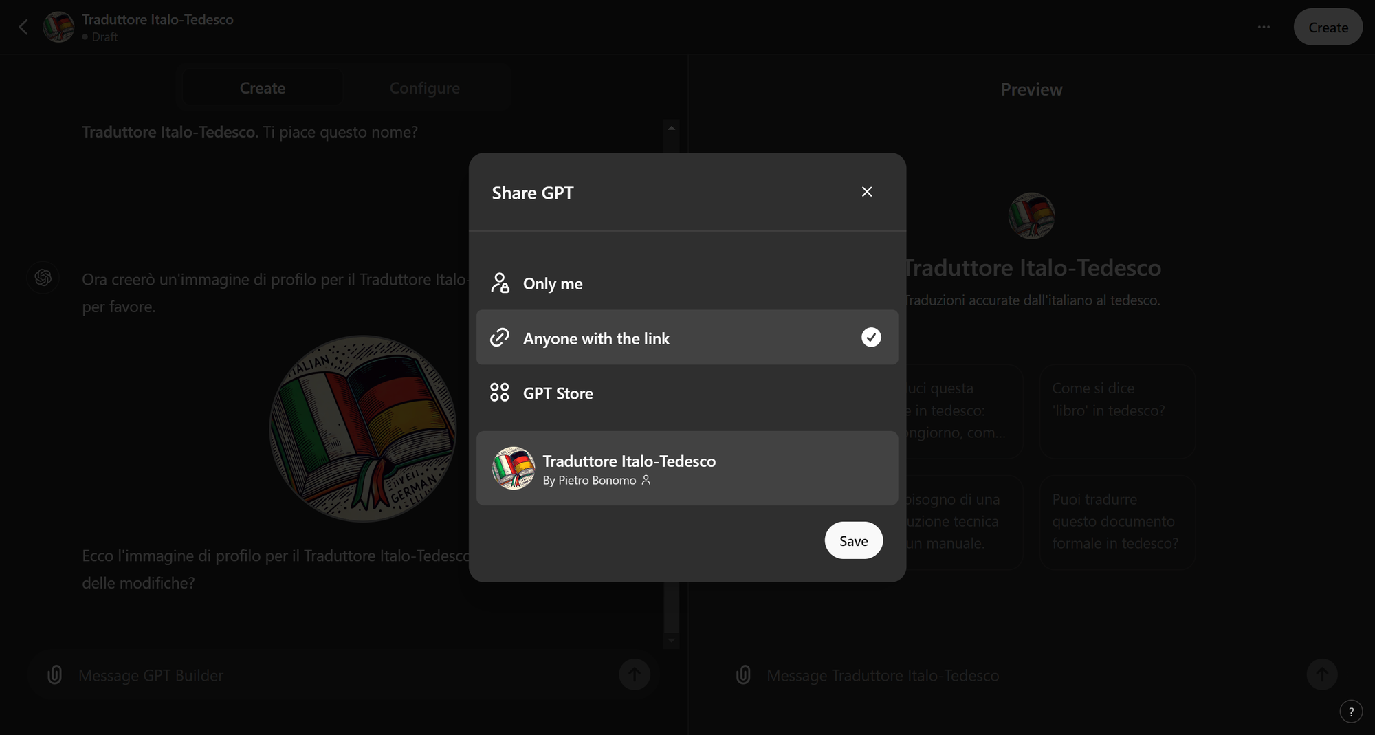 Anyone with the link: il GPT non sarà pubblico, ma disponibile a chiunque ha il link. Ideale per condividere il GPT con il tuo team.